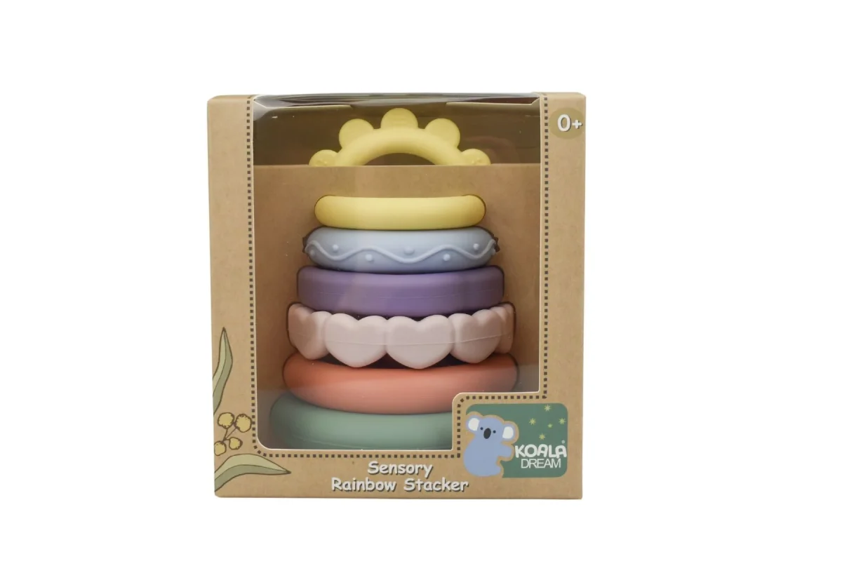 Explore the Silicone Stacking Rainbow Teether from Koala Dream, a vibrant and engaging toy designed to stimulate sensory exploration and teething relief for little ones. This colourful teether features six stacking rings with delightful shapes and textures, encouraging children to grasp, explore, and feel.