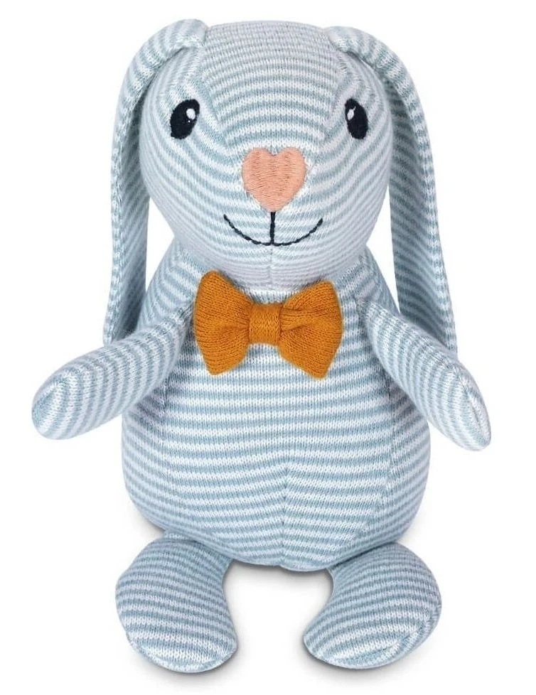 An adorably soft and cuddly bunny made from 100% organic cotton knit fabric. Features extra-long, floppy ears. Embroidered nose, mouth and eyelashes. Its knitted fabric offers a wonderfully textured, classic, plush toy experience.